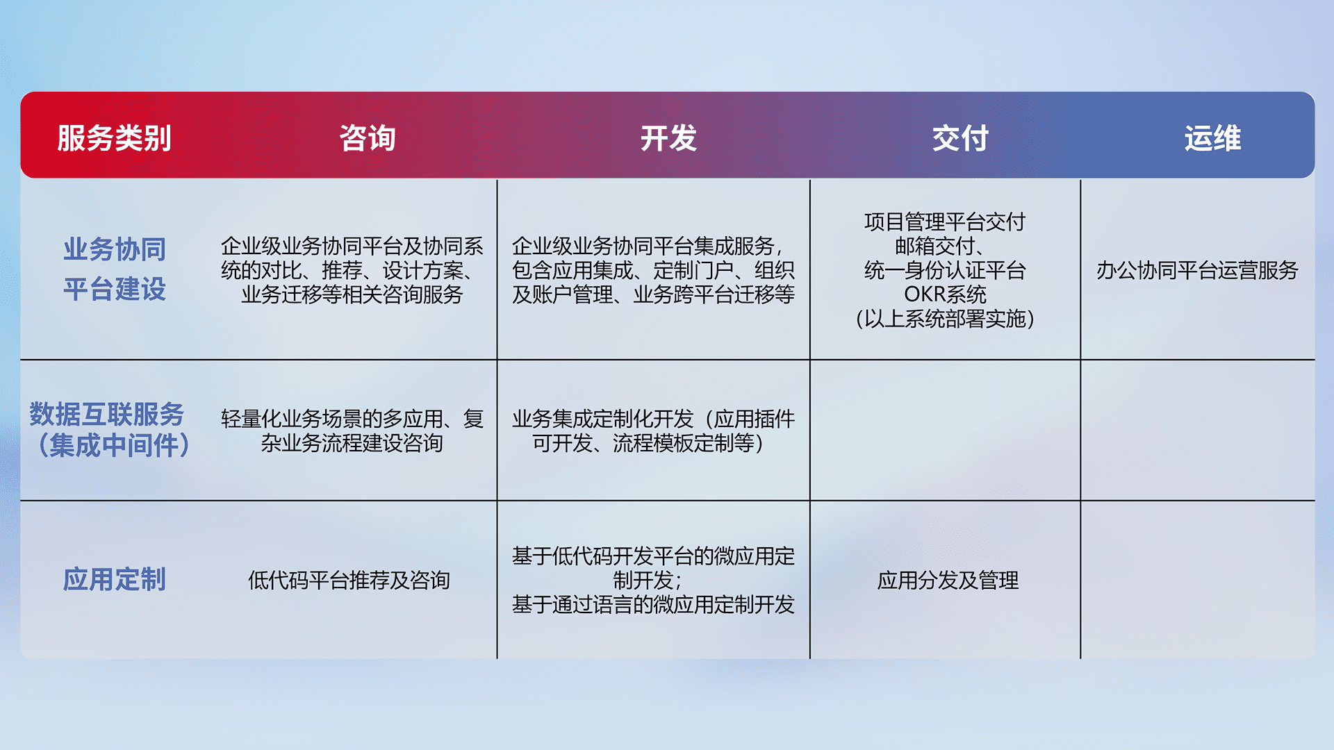 针对钉钉、、、、企微、、、、IDaas等平台级产品提供产品的规划、、、、方案、、交付、、、定制化开发等服务,,实现如统一协同办公、、、智能客户服务、、、混合会议管理、、、、智能数据查询、、、等业务场景,,实现数字化转型。。。。