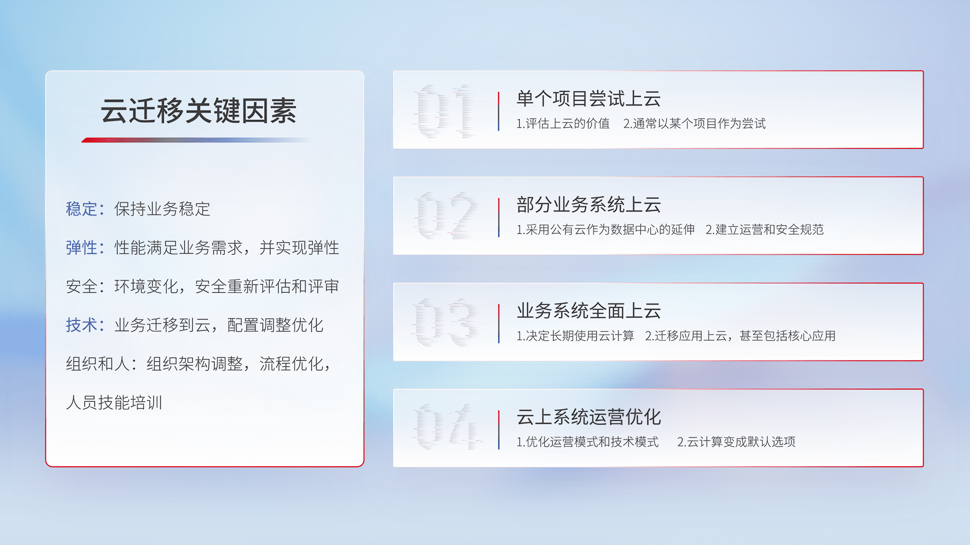 结合实际业务,,,,从规划设计、、云平台选型、、、、云原生改造、、数据迁移、、、集成交付,,迁移全过程为客户识别最佳上云路径,,,做好风险识别管理,,,,设计网络架构、、、身份权限、、、安全审计合规、、、操作审计、、、、日志审计、、、、监控告警策略、、、多站点容灾设计等,,对云上基础设施进行整体规划,,,提升IT治理水平,,,,以满足弹性、、、高可用、、高性能的需求。。。