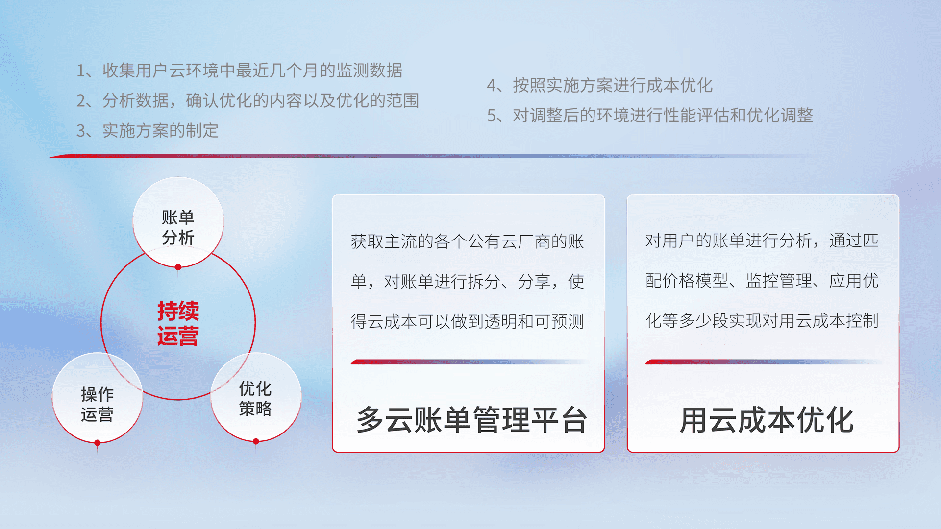 通过多云纳管,,以统一的资源数据模型把客户的云资源进行抽象和封装,,,,进而实现对多云资源的统一操作,,,保障云资源管理的可靠性、、、稳定性与可用性。。量身定制化运维内容,,配置、、、开发运维、、、补丁管理、、、、备份、、监控、、、、认证和访问管理、、审计和日常巡检等,,保障在用云过程中的可靠度,,稳定度以及高可用率。。